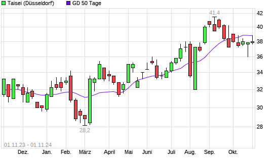 Mit dem Rücksetzer auf 38,40 EUR hat die Taisei-Aktie am 31.10.2024 die 50-Tage-Linie nach unten gekreuzt.
