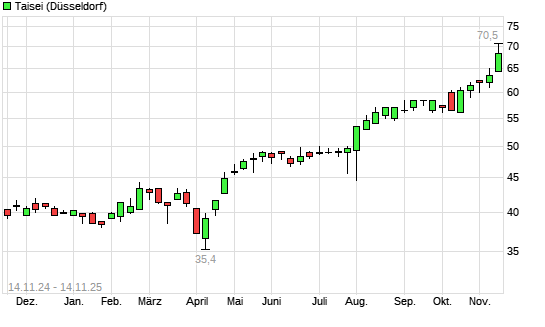 Mit dem Anstieg auf 71,00 EUR hat die Taisei-Aktie (ISIN JP3443600006) am 13.11.2025 ein neues All-Time-High erreicht und damit den Kurs vom 12.11.2025 eingestellt.Die Taisei-Aktie befindet ...weiterlesen