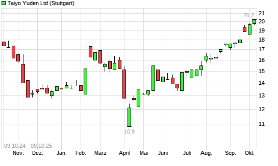 Mit dem Anstieg auf 20,20 EUR hat die Taiyo Yuden-Aktie (ISIN JP3452000007) am 08.10.2025 ein neues 12-Monats-Hoch erreicht und damit den Kurs vom 06.10.2025 eingestellt.