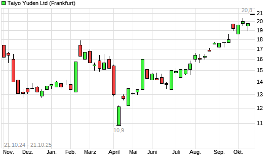 Mit dem Anstieg auf 20,80 EUR hat die Taiyo Yuden-Aktie (ISIN JP3452000007) am 20.10.2025 ein neues 12-Monats-Hoch erreicht und damit den Kurs vom 09.10.2025 eingestellt.
