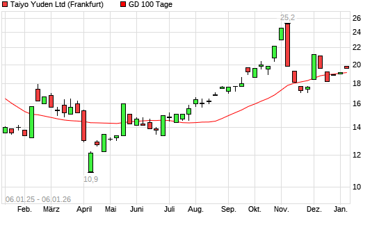 Mit dem Anstieg auf 19,80 EUR hat die Taiyo Yuden-Aktie am 05.01.2026 die 100-Tage-Linie nach oben gekreuzt.