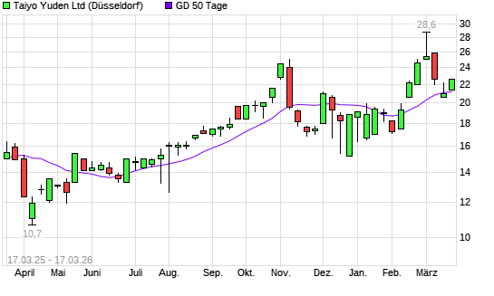 Mit dem Anstieg auf 21,60 EUR hat die Taiyo Yuden-Aktie am 16.03.2026 die 50-Tage-Linie nach oben gekreuzt.
