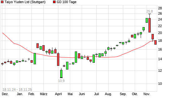 Mit dem Rücksetzer auf 17,70 EUR hat die Taiyo Yuden-Aktie am 17.11.2025 die 100-Tage-Linie nach unten gekreuzt.
