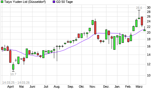 Mit dem Rücksetzer auf 21,20 EUR hat die Taiyo Yuden-Aktie am 13.03.2026 die 50-Tage-Linie nach unten gekreuzt.