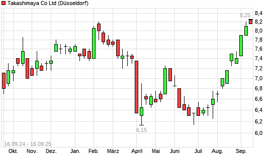 Mit dem Anstieg auf 8,25 EUR hat die Takashimaya-Aktie (ISIN JP3456000003) am 15.09.2025 ein neues 12-Monats-Hoch erreicht und damit den Kurs vom 12.09.2025 eingestellt.