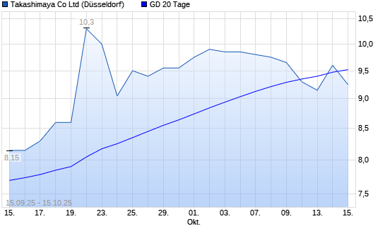Mit dem Anstieg auf 9,70 EUR hat die Takashimaya-Aktie am 14.10.2025 die 20-Tage-Linie nach oben gekreuzt.