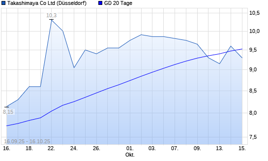 Mit dem Rücksetzer auf 9,40 EUR hat die Takashimaya-Aktie am 15.10.2025 die 20-Tage-Linie nach unten gekreuzt.