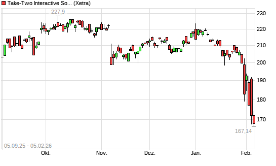 Mit dem Rücksetzer auf 172,00 EUR hat die Take 2 Interactive-Aktie (ISIN US8740541094) am 04.02.2026 ein neues 12-Monats-Tief erreicht und damit den Kurs vom 05.02.2025 eingestellt.