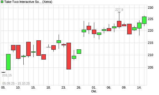 Mit dem Anstieg auf 224,05 EUR hat die Take 2 Interactive-Aktie (ISIN US8740541094) am 14.10.2025 ein neues All-Time-High erreicht und damit den Kurs vom 13.10.2025 eingestellt.