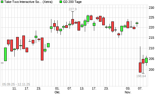 Mit dem Anstieg auf 208,05 EUR hat die Take 2 Interactive-Aktie am 11.11.2025 die 200-Tage-Linie nach oben gekreuzt.