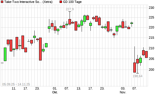 Mit dem Rücksetzer auf 205,95 EUR hat die Take 2 Interactive-Aktie am 13.11.2025 die 100-Tage-Linie nach unten gekreuzt.