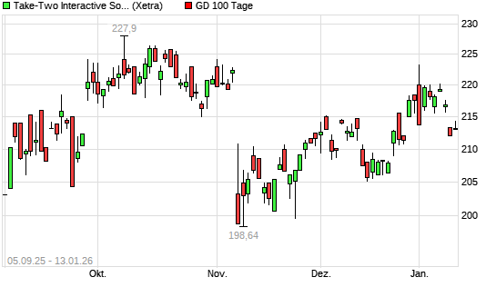 Mit dem Rücksetzer auf 211,85 EUR hat die Take 2 Interactive-Aktie am 12.01.2026 die 100-Tage-Linie nach unten gekreuzt.