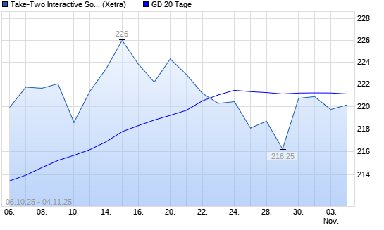 Mit dem Rücksetzer auf 218,85 EUR hat die Take 2 Interactive-Aktie am 03.11.2025 die 20-Tage-Linie nach unten gekreuzt.