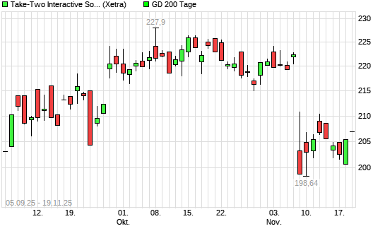 Mit dem Rücksetzer auf 199,30 EUR hat die Take 2 Interactive-Aktie am 18.11.2025 die 200-Tage-Linie nach unten gekreuzt.