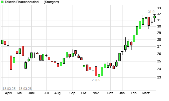 Mit dem Anstieg auf 31,79 EUR hat die Takeda Pharmaceutical-Aktie (ISIN JP3463000004) am 17.03.2026 ein neues 3-Jahres-Hoch erreicht und damit den Kurs vom 19.02.2026 eingestellt.