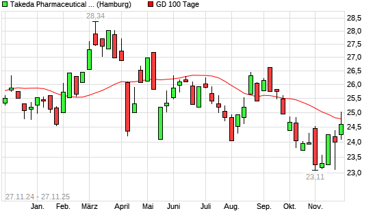 Mit dem Anstieg auf 24,86 EUR hat die Takeda Pharmaceutical-Aktie am 26.11.2025 die 100-Tage-Linie nach oben gekreuzt.