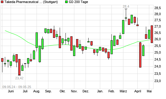 Mit dem Rücksetzer auf 25,65 EUR hat die Takeda Pharmaceutical-Aktie am 08.05.2025 die 200-Tage-Linie nach unten gekreuzt.