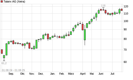 Mit dem Anstieg auf 116,80 EUR hat die Talanx-Aktie (ISIN DE000TLX1005) am 31.07.2025 ein neues All-Time-High erreicht und damit den Kurs vom 02.06.2025 eingestellt.