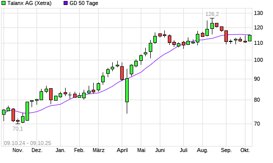 Mit dem Anstieg auf 116,10 EUR hat die Talanx-Aktie am 08.10.2025 die 50-Tage-Linie nach oben gekreuzt.