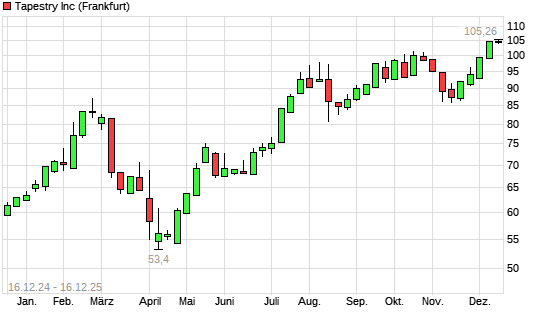 Mit dem Anstieg auf 105,12 EUR hat die Tapestry-Aktie (ISIN US8760301072) am 15.12.2025 ein neues All-Time-High erreicht und damit den Kurs vom 12.12.2025 eingestellt.