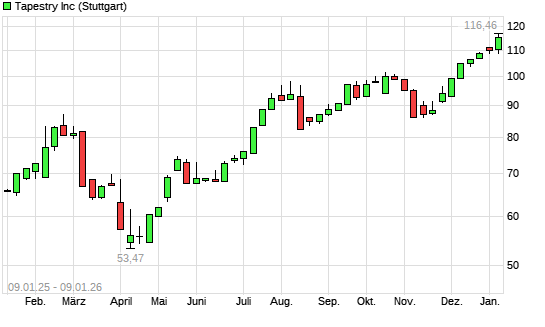 Mit dem Anstieg auf 114,20 EUR hat die Tapestry-Aktie (ISIN US8760301072) am 08.01.2026 ein neues All-Time-High erreicht und damit den Kurs vom 06.01.2026 eingestellt.