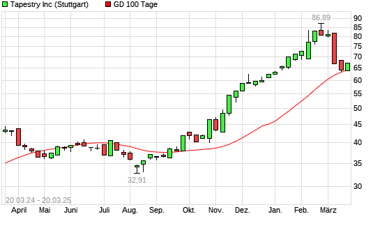 Mit dem Anstieg auf 67,30 EUR hat die Tapestry-Aktie am 19.03.2025 die 100-Tage-Linie nach oben gekreuzt.