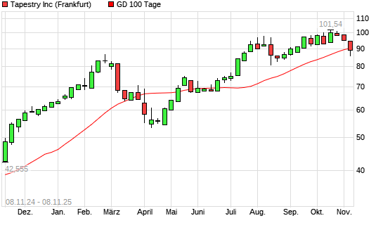 Mit dem Rücksetzer auf 88,98 EUR hat die Tapestry-Aktie am 07.11.2025 die 100-Tage-Linie nach unten gekreuzt.