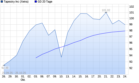 Mit dem Rücksetzer auf 98,35 EUR hat die Tapestry-Aktie am 24.10.2025 die 20-Tage-Linie nach unten gekreuzt.