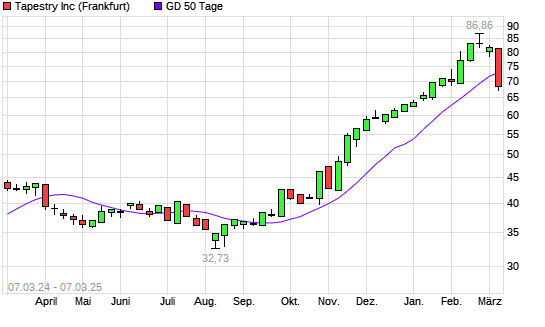 Mit dem Rücksetzer auf 71,83 EUR hat die Tapestry-Aktie am 06.03.2025 die 50-Tage-Linie nach unten gekreuzt.
