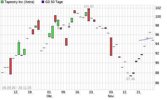 Mit dem Rücksetzer auf 94,03 EUR hat die Tapestry-Aktie am 28.11.2025 die 50-Tage-Linie nach unten gekreuzt.