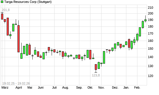 Mit dem Anstieg auf 188,90 EUR hat die Targa Resources-Aktie (ISIN US87612G1013) am 18.02.2026 ein neues 6-Monats-Hoch erreicht und damit den Kurs vom 16.02.2026 eingestellt.