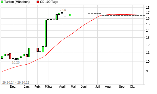 Mit dem Rücksetzer auf 16,40 EUR hat die Tarkett SA Ord Shs-Aktie am 28.10.2025 die 100-Tage-Linie nach unten gekreuzt.