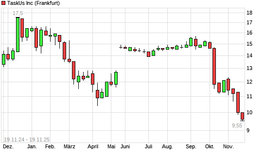 Mit dem Rücksetzer auf 9,55 EUR hat die TaskUs A-Aktie (ISIN US87652V1098) am 18.11.2025 ein neues 12-Monats-Tief erreicht und damit den Kurs vom 17.11.2025 eingestellt.