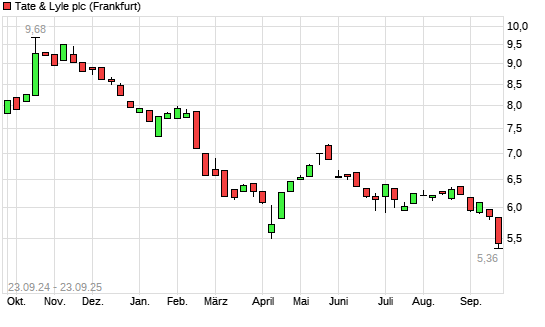 Mit dem Rücksetzer auf 5,36 EUR hat die Tate & Lyle-Aktie (ISIN GB00BP92CJ43) am 22.09.2025 ein neues 10-Jahres-Tief erreicht und damit den Kurs vom 07.04.2025 eingestellt.