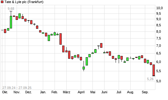 Mit dem Rücksetzer auf 5,26 EUR hat die Tate & Lyle-Aktie (ISIN GB00BP92CJ43) am 26.09.2025 ein neues 10-Jahres-Tief erreicht und damit den Kurs vom 25.09.2025 eingestellt.
