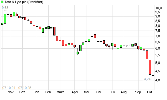 Mit dem Rücksetzer auf 4,24 EUR hat die Tate & Lyle-Aktie (ISIN GB00BP92CJ43) am 06.10.2025 ein neues 10-Jahres-Tief erreicht und damit den Kurs vom 03.10.2025 eingestellt.