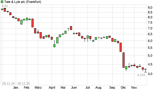 Mit dem Rücksetzer auf 4,10 EUR hat die Tate & Lyle-Aktie (ISIN GB00BP92CJ43) am 25.11.2025 ein neues 10-Jahres-Tief erreicht und damit den Kurs vom 08.10.2025 eingestellt.