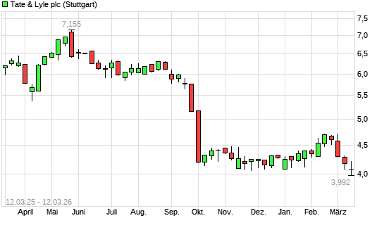 Mit dem Rücksetzer auf 4,02 EUR hat die Tate & Lyle-Aktie (ISIN GB00BP92CJ43) am 11.03.2026 ein neues 10-Jahres-Tief erreicht und damit den Kurs vom 04.03.2026 eingestellt.