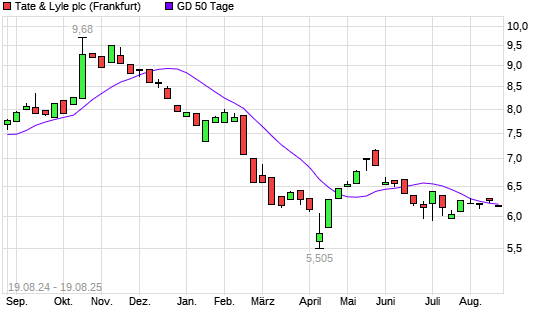 Mit dem Rücksetzer auf 6,16 EUR hat die Tate & Lyle-Aktie am 18.08.2025 die 50-Tage-Linie nach unten gekreuzt.