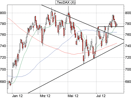 Rosenheim (DAX-Premium-Trader) - Der TecDAX hat sich Anfang August bis kurz vor die Marke von 800 Punkten geschoben. Das war ein bisschen zuviel des Guten, weshalb die Kurse zum Wochenbeginn auf 773 Zähler zurücksetzten. Wie zum Monatswechsel fand das deutsche Technologie- Barometer auf diesem Niveau vorerst Halt, worauf die Notierungen in den vergangenen drei Sitzungen wieder anzogen. Der Rücksetzer kann daher als erfolgreiche Pullback-Bewegung gewertet werden, wodurch der Ausbruch über die Juli-Hochs mustergültig bestätigt wurde. Damit bestehen nun gute Chancen, dass der TecDAX erneut die magische Marke von 800 Punkten ins Visier nimmt.