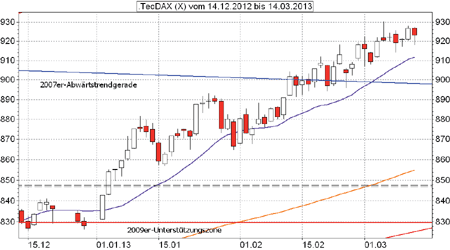 Rosenheim (DAX-Premium-Trader) - Im Vergleich zum Mittelstandsbarometer war die Schwankungsbreite (Volatilität) im TecDax vergangene Woche zwar höher, doch neue Erkenntnisse brachte uns das nicht. Denn am Ende standen summa summarum nur 0,8% Wochenbewegung auf den Anzeigetafeln.