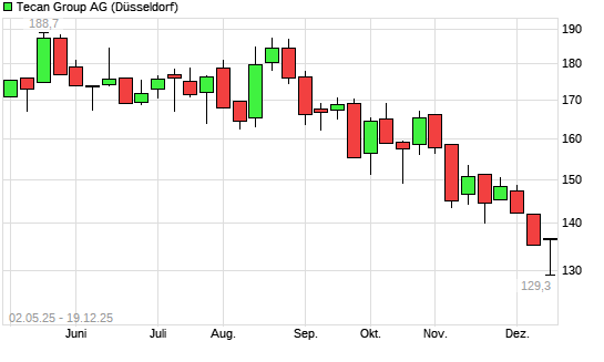 Mit dem Rücksetzer auf 132,30 EUR hat die Tecan Group-Aktie (ISIN CH0012100191) am 18.12.2025 ein neues 5-Jahres-Tief erreicht und damit den Kurs vom 17.12.2025 eingestellt.