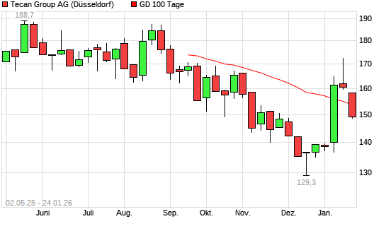 Mit dem Rücksetzer auf 152,40 EUR hat die Tecan Group-Aktie am 23.01.2026 die 100-Tage-Linie nach unten gekreuzt.
