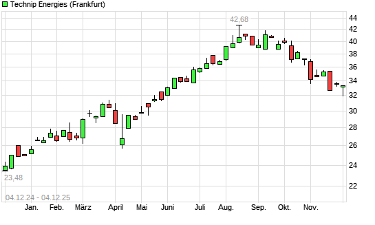Mit dem Rücksetzer auf 31,94 EUR hat die Technip Energies-Aktie (ISIN NL0014559478) am 03.12.2025 ein neues 6-Monats-Tief erreicht und damit den Kurs vom 21.11.2025 eingestellt.