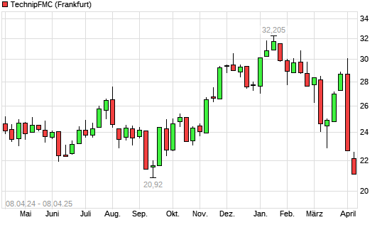 Mit dem Rücksetzer auf 21,83 EUR hat die TechnipFMC-Aktie (ISIN GB00BDSFG982) am 07.04.2025 ein neues 6-Monats-Tief erreicht und damit den Kurs vom 23.10.2024 eingestellt.