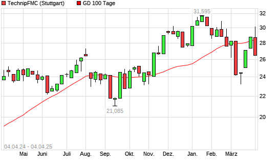 Mit dem Rücksetzer auf 26,76 EUR hat die TechnipFMC-Aktie am 03.04.2025 die 100-Tage-Linie nach unten gekreuzt.