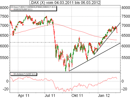 Der Dax gab um gut 3% und damit so viel nach wie zuletzt am 1. November, liegt seit Jahresanfang aber 12% im Plus. Verluste von knapp 4% führten den MDax erstmals seit Ende Januar unter die wichtige 10.000er-Grenze. An den Long-Positionen halten Sie bitte trotzdem fest (Dax im Schnitt +15%, MDax +5%).