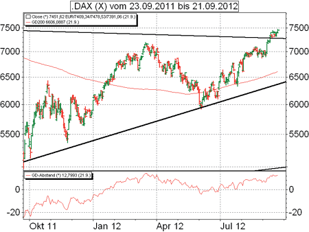 Der Dax erreichte den höchsten Schlusstand seit über zwölf Monaten (7452). Auch das Mid-Cap-Barometer MDax präsentierte sich mit fast 1% Plus auf 11.214 so gut wie noch nie im September. Schließlich gelang dem TecDax bei 819 Zählern ebenfalls ein neues Zwölf Monats-Hoch. Deshalb lassen Sie bitte alle Positionen laufen (Dax +17% und +4%, MDax +14% bzw. +1%, TecDax +13%). Angesichts zunehmender Trend-Stärke stehen die nächsten Long-Engagements an.