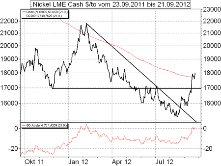 Mächtige Gewinne von durchschnittlich fast 2% verzeichneten die Rohstoffe. Dabei wurde Rohöl Tagessieger und legte gut 3% zu. Trotz des Wechsels in den Abwärtstrend hatten wir an unserer Long-Position festgehalten und bleiben dabei. Ziehen Sie den mentalen Stop-Loss bitte hoch. Gold erreichte mit fast +2% ein neues Sechs-Monats-Hoch (1785) und setzt den Angriff auf das Allzeithoch 1895 unbeirrt fort. Hier lassen Sie die Ende August und Mitte September erworbenen Long-Zertifikate bitte unverändert laufen (bislang +8% sowie +4%). Auch Silber zeigte sich stark (Schlusskurs 35 Dollar/Unze). Den zweiten Long-Titel für das weiße Edelmetall erwerben wir bei Schlusskursen über 38. Blei markierte bei 2276 ein neues Sechs-Monats-Hoch. Sobald das Industriemetall oberhalb von 2300 aus dem Handel geht, kaufen wir unser erstes Long-Zertifikat. Nickel legte gestern ebenfalls gut 2% zu, sodass unser Stop-Buy-Limit gegriffen hat.
