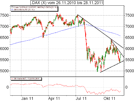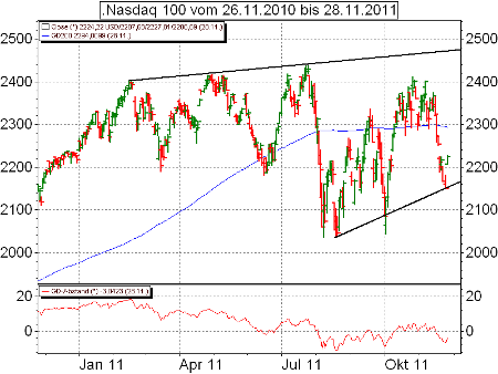 Vor einer möglichen Jahresendrallye stehen auch die USMärkte. Der Nasdaq 100 sowie der Dow Jones sind 3% bzw. 4% von der 200-Tage-Linie entfernt. Wenn die Technologie-Börse auf 2300 steigt, liegt das nächste Kursziel beim Widerstand von 2400. Darüberhinaus hat der Index Potenzial bis zur Aufwärtstrendgeraden bei fast 2500.